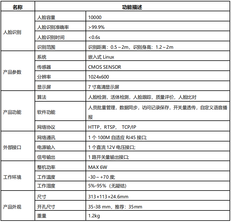 動態(tài)人臉識別終端以高性能、高可靠性、高穩(wěn)定性的嵌入式系統(tǒng)為平臺, 以行業(yè)領先的深度學習算法為核心,實現了人臉檢測、活體檢測、毫秒級人臉識別及人臉比對應用。產品具有超大容量人臉庫,超高的人臉識別準確率等特點。